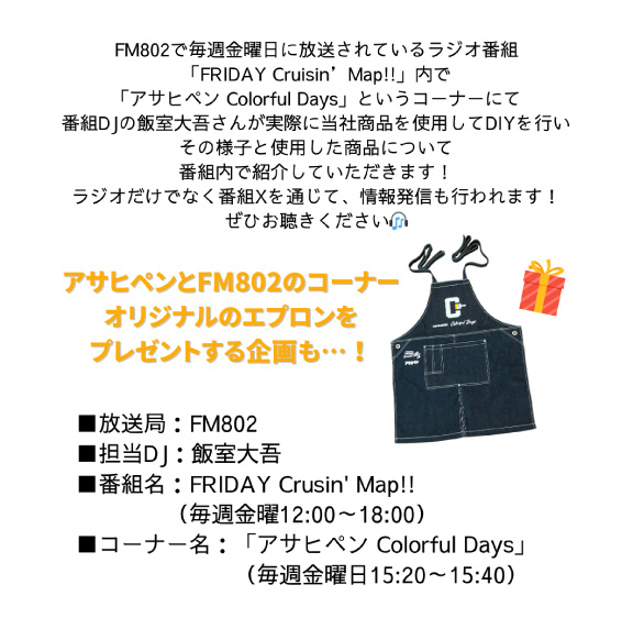 アサヒペンとFM802「FRIDAY Cruisin’ Map!!」オリジナルのグッズをプレゼントする企画も予定しております。