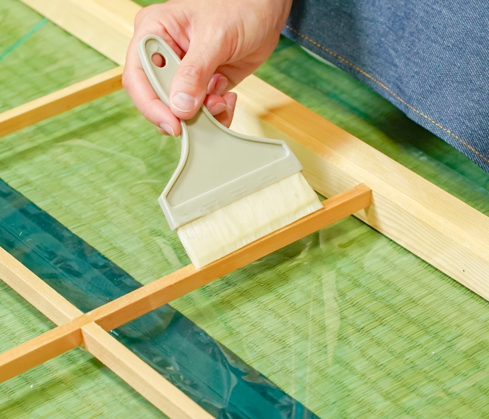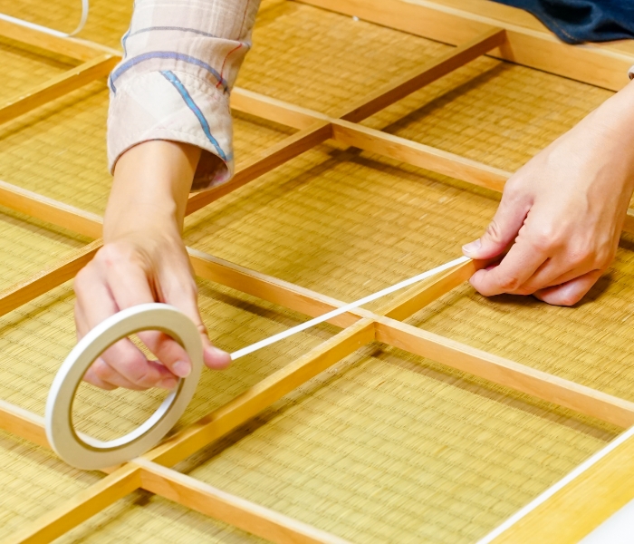 昔からの貼り方です。桟にのりをつけて貼っていきます。伝統的な美しい仕上がりです。