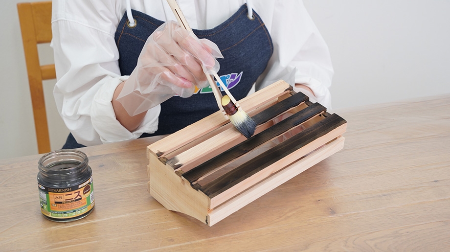 ④ニス用のハケにニスを含ませ、木目に沿ってニスを塗っていきます。