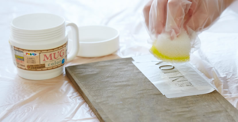 木材には、水性多用途マグカラーの白をスポンジに付けてステンシル!