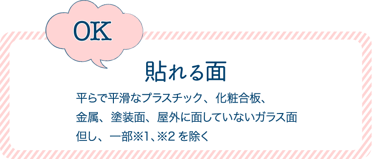 ※1 下地の表面がセロハンテープで容易にはがれる面や、プリント化粧板や経年劣化した塗装面は、はがす時に下地を傷める場合があります。