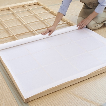 昔からの貼り方です。桟にのりをつけて貼っていきます。伝統的な美しい仕上がりです。