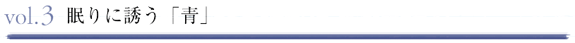 同じ室温でも、寒色系の部屋と暖色系の部屋では体感温度が2~3度異なるといいます。寒色の青には副交感神経に働きかけて血圧・脈拍・呼吸数などを低下させ、心を落ち着ける効果があります。寝室は照明にも一工夫を。睡眠前に白く明るい蛍光灯の光を浴びると、睡眠ホルモン「メラトミン」の分泌が抑制され、深い眠りを妨げるといわれています。照明にはあたたかみのある電球色を、寝具やパジャマ等には淡い青を取り入れると、自然な眠りへと誘う寝室になるはずです。